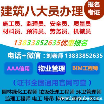 钢筋工,塔吊,咨询刘老师,信号工,塔吊,养护工,污水处理工,除尘工,抹灰工,管工等真实有效,全国通用咨询报名联系刘老师。建筑12大员:(施工员、质检员、资料员、材料员、试验员、测量员、监理员安全员咨询刘老师、合同员、劳务管理员)850元,技术员850元、每月一期培训全国统一报考热线报考咨询联系刘老师建筑八大员报考咨询物业管理证书报名报考